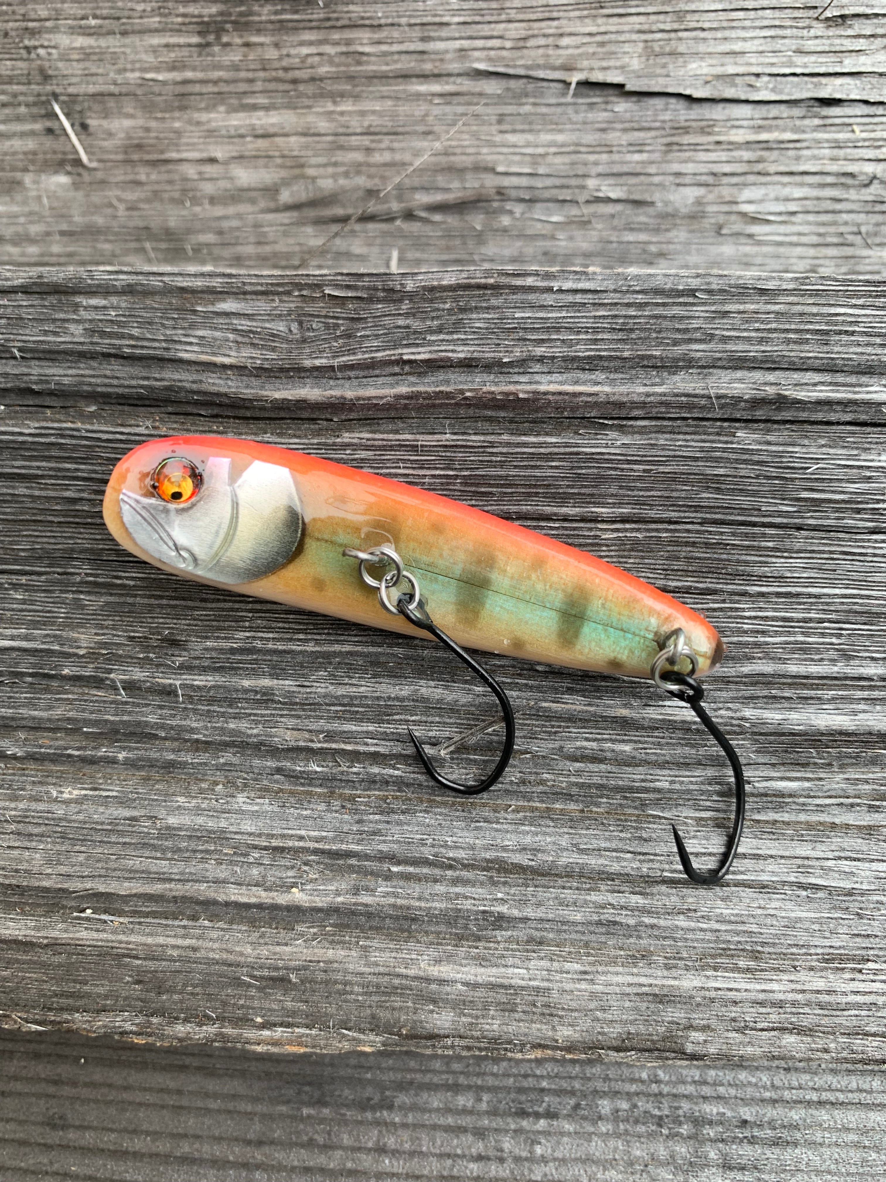 AGフラット60は本家ヘリン、フラットフィッシュのリペイントから開発がスタートしました。リペイントで重くなったボディから出るアクションがとても魚の反応が良く、昔ウッドモデルがあった事から作る事にしました。